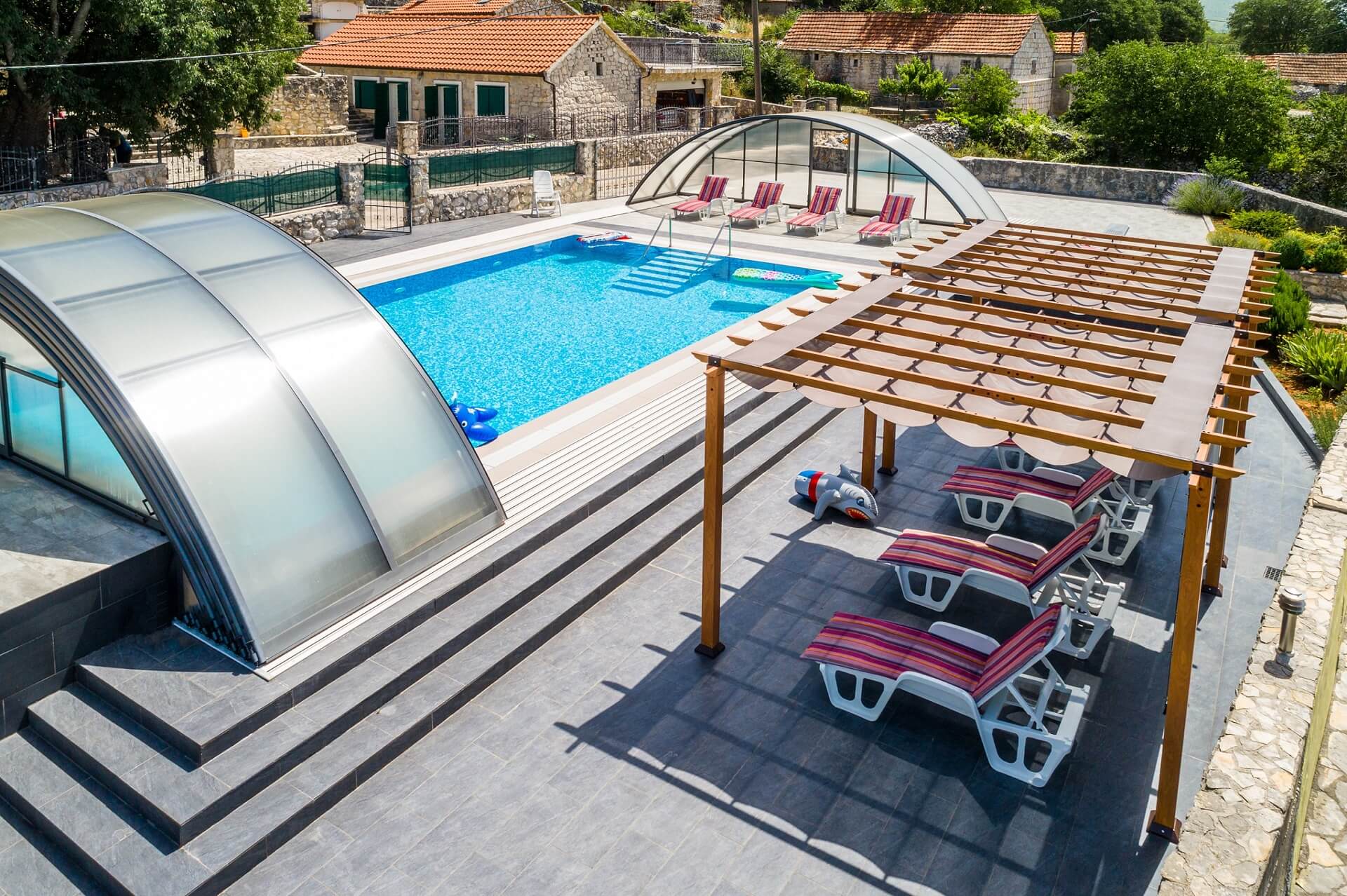 Cooling off in the large private swimming pool of 72 m2, which is fenced, is available only to guests of the villa. This luxury heated pool is equipped with movable high covers that allow swimming regardless of the weather conditions. Guests who don't like direct sun by the pool can sunbathe under covered pergolas with deck chairs. There is a possibility of heating the pool.